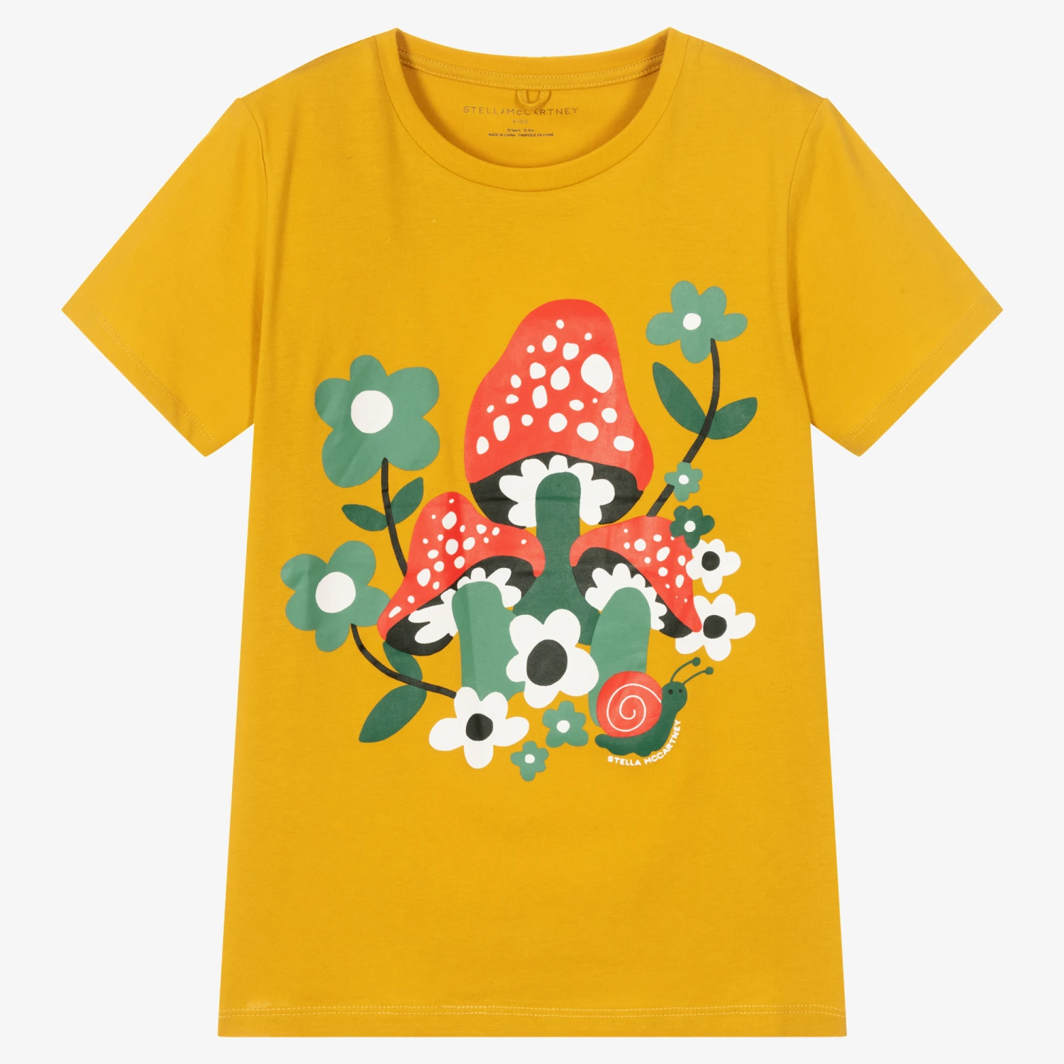 Mustard yellow T-shirt for teen girls by British brand, Stella McCartney Kids. Made in comfortable, organic cotton jersey, it has an eye-catching mushroom, flower and snail print on the front in red, green and white, with a discreet white logo.