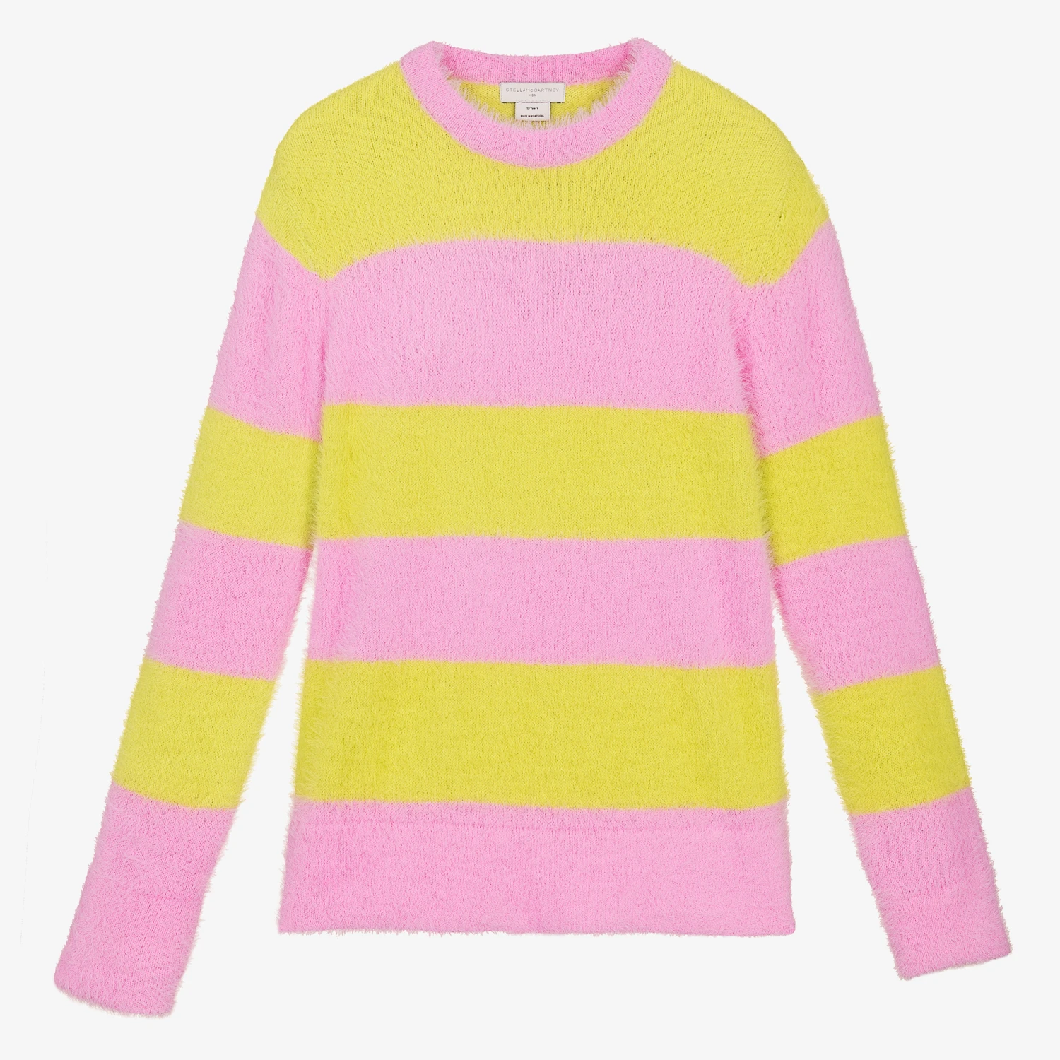 Pink and yellow striped sweater for teen girls by British designer Stella McCartney Kids, made in super soft nylon, with a fluffy feel. Epitomising the playfulness of 90’s fashion, this stylish piece is directly inspired by the womenswear collection.