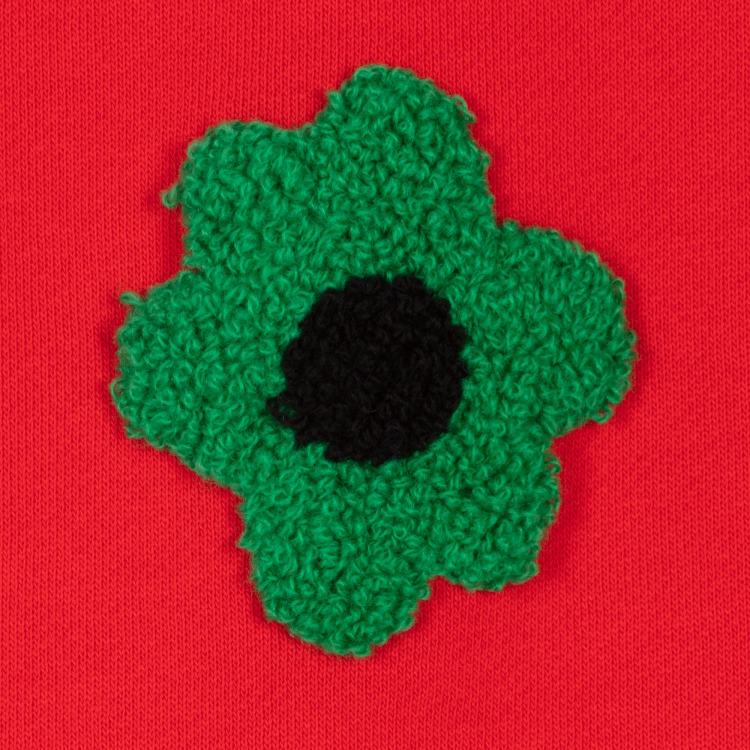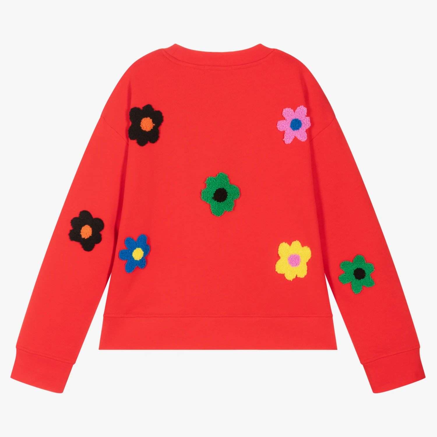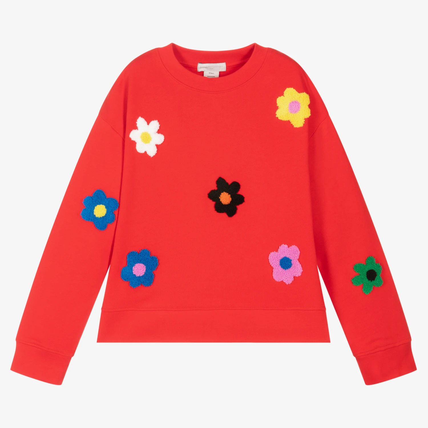 Red oversized sweatshirt for teen girls by British brand Stella McCartney Kids. In a boxy fit, the front and back are decorated with fun and colourful flower appliqués in soft bouclé. Cosy and comfortable to wear, it is made in mid-weight organic cotton jersey, with a soft fleecy inside.
