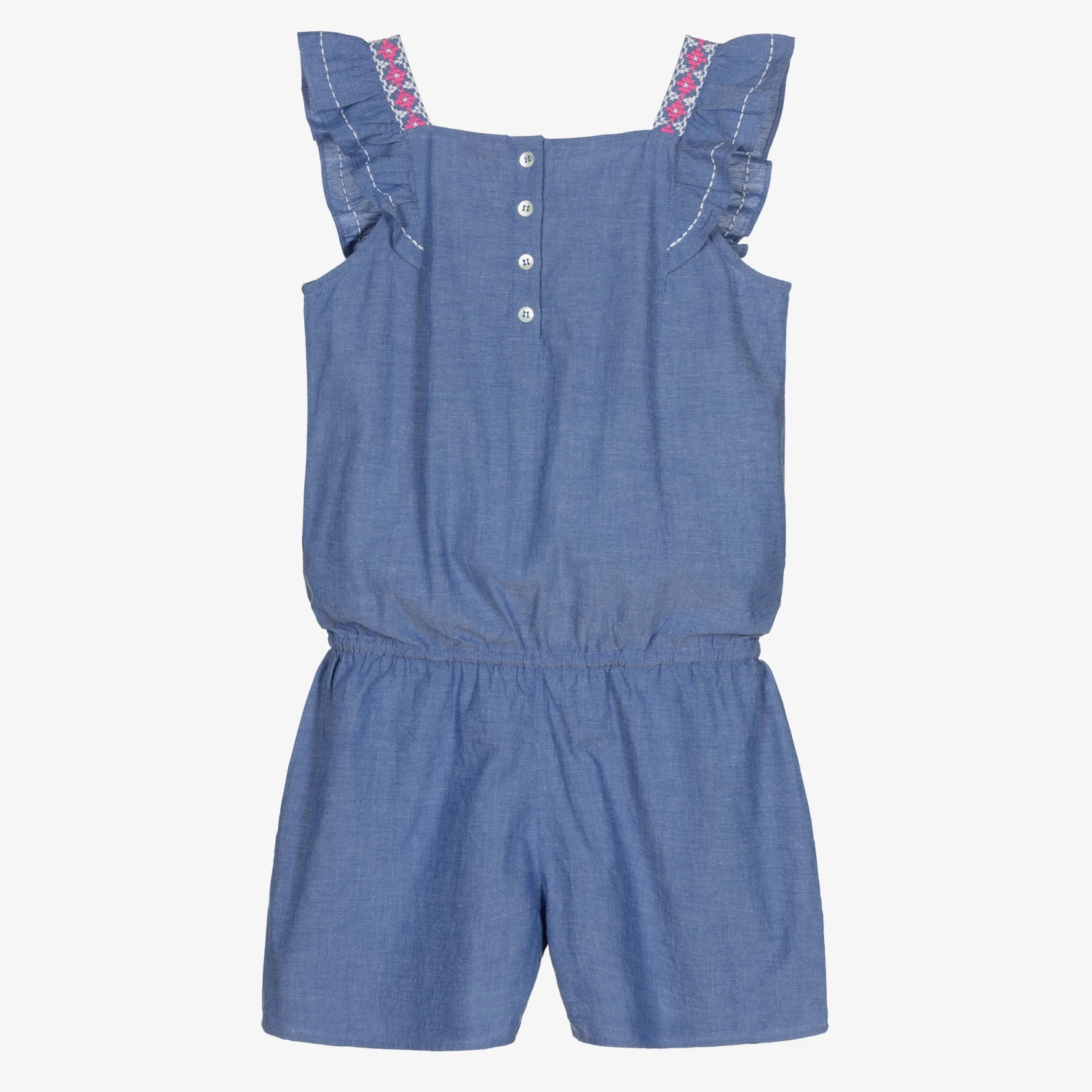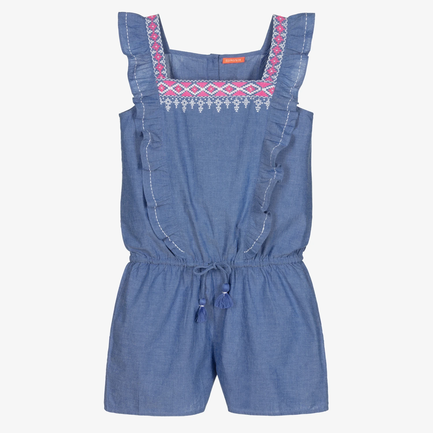Blue cotton chambray playsuit for teen girls by Sunuva. Soft and lightweight, the square neckline is decorated with beautiful embroidery in white and neon pink with intricate cross stitch details. There are fun tassels on the elasticated drawstring waist and ruffle trims. It fastens with mother-of-pearl buttons on the back.