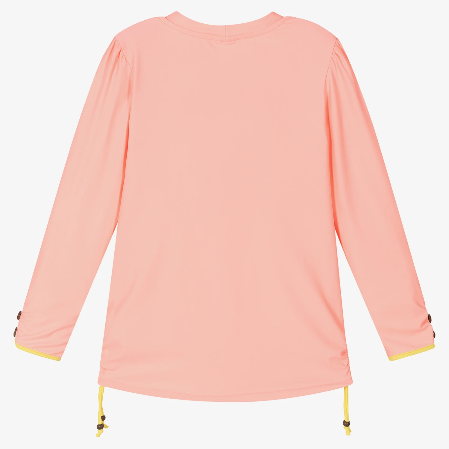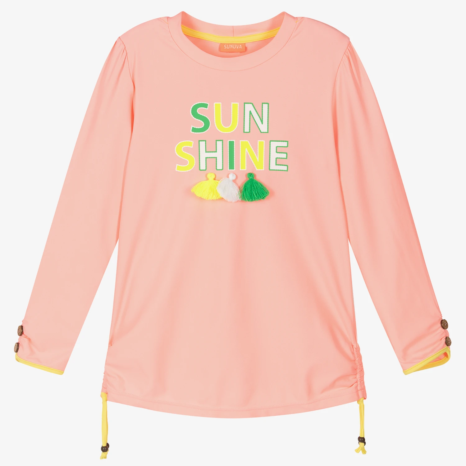Pink long-sleeved swim top for teen girls by Sunuva, with a fun ‘sun shine’ print and tassel appliqués in green, white and neon yellow. Made from silky, stretchy recycled fabric, this eye-catching rash vest has stylish ruching on the cuffs and side seams, with decorative coconut buttons and yellow tie detail.