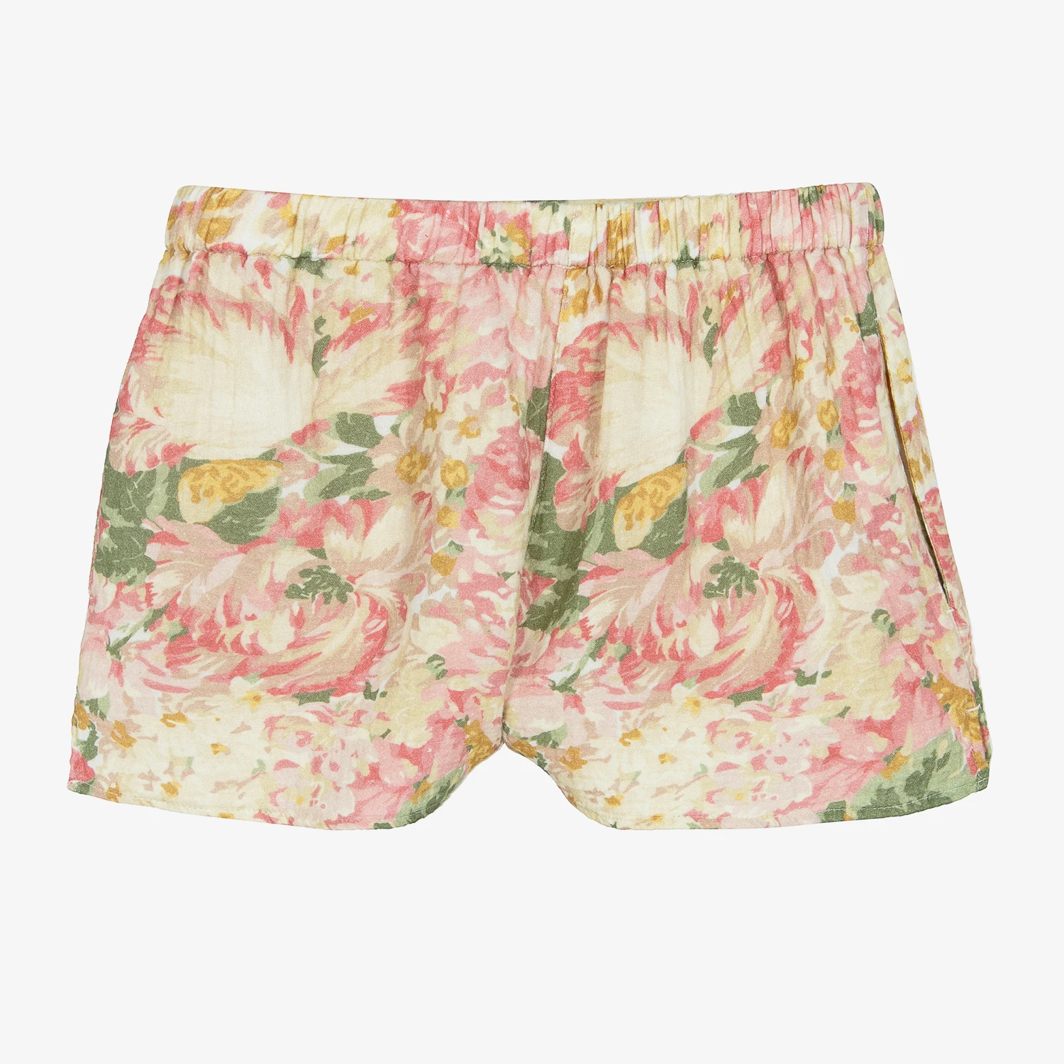 Teen girls beige and pink floral shorts by The Animals Observatory, woven in soft, lightweight, textured cotton. Decorated in soft, muted colours, they have an elegant, vintage-inspired design all-over. Not only stylish, they have an elasticated waist for comfort and a floaty, flattering shape. The brand’s diamond logo is embroidered in green near the hem, for a contemporary, branded twist.