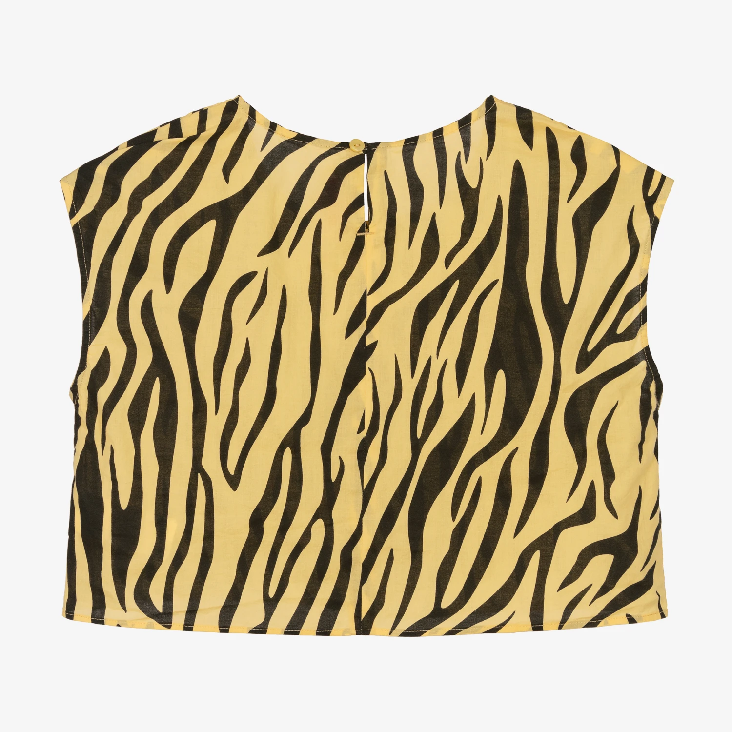 A cool black and yellow top for teen girls by The Animals Observatory, designed in a timeless zebra print. Cut for a boxy fit, this fashionable piece has red logo embroidery on the chest for brand appeal. With a lightweight feel, it is made in a soft cotton weave and fastens with a single button fastening on the back of the neck.