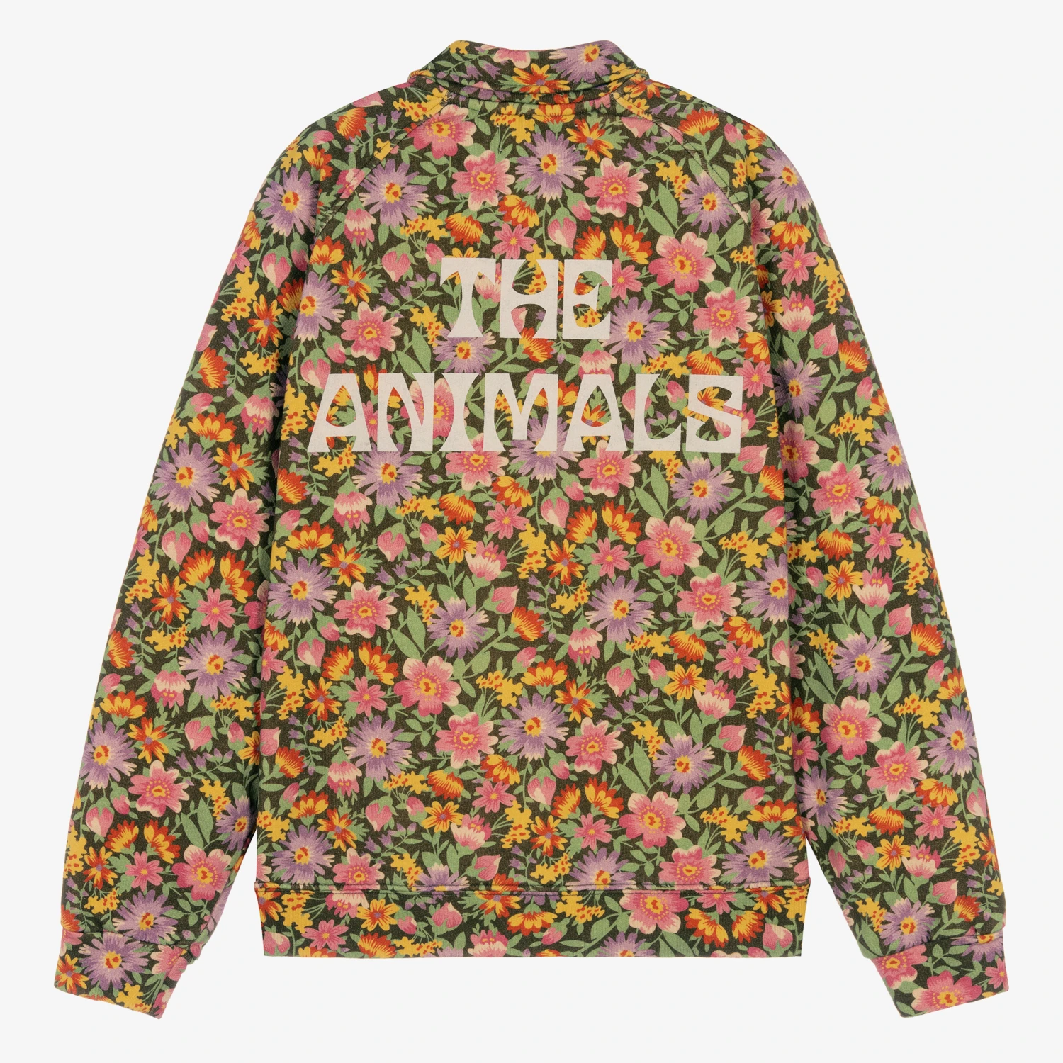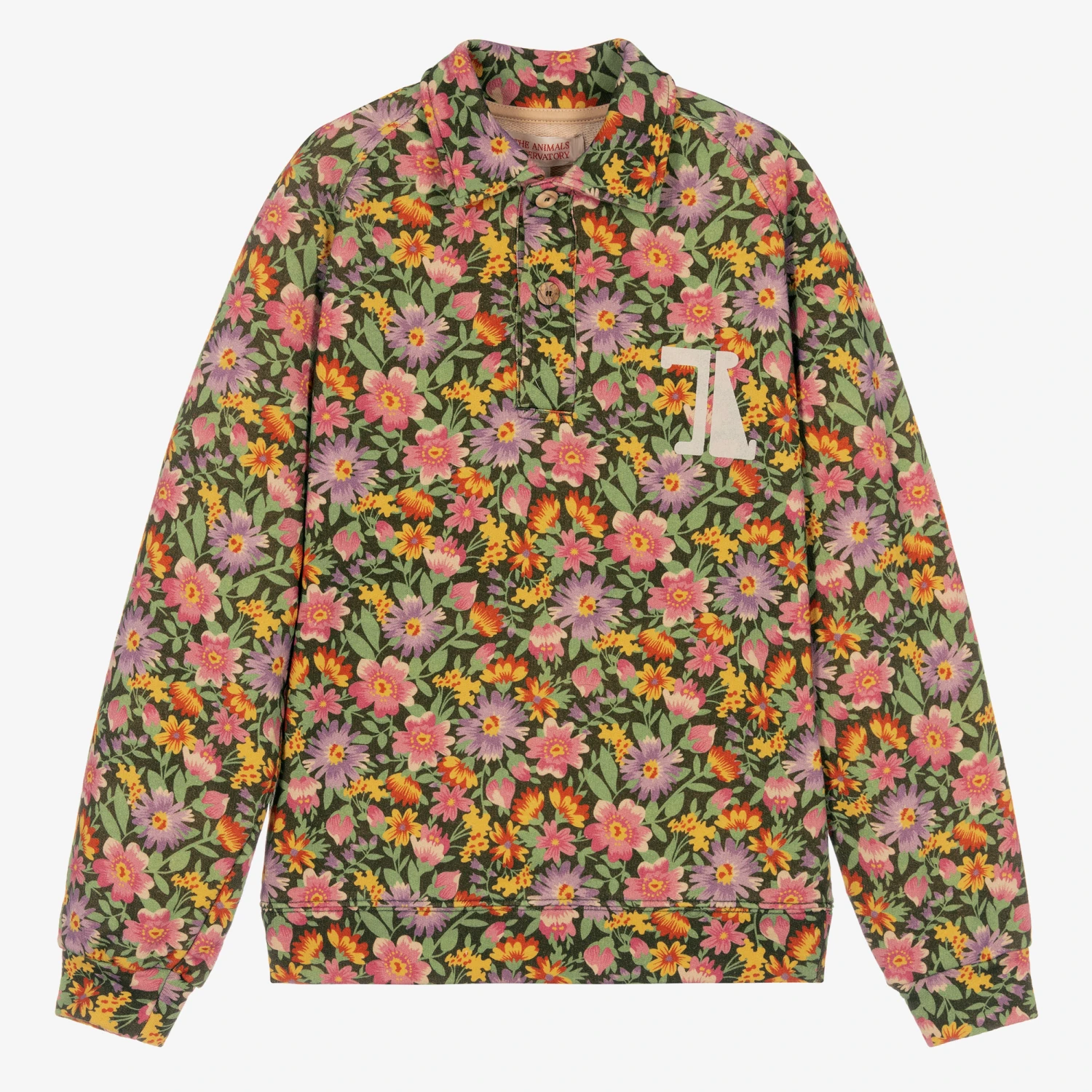 Colourful cotton top for teen girls by The Animals Observatory, with the brand’s logo printed on one side in ivory. Inspired by the beauty and romance of a spring flower field, it is patterned with pink and yellow flowers on a green background. It fastens with wood-effect buttons on the front and is made in comfortable sweatshirt jersey with raglan sleeves, ideal for relaxed days.