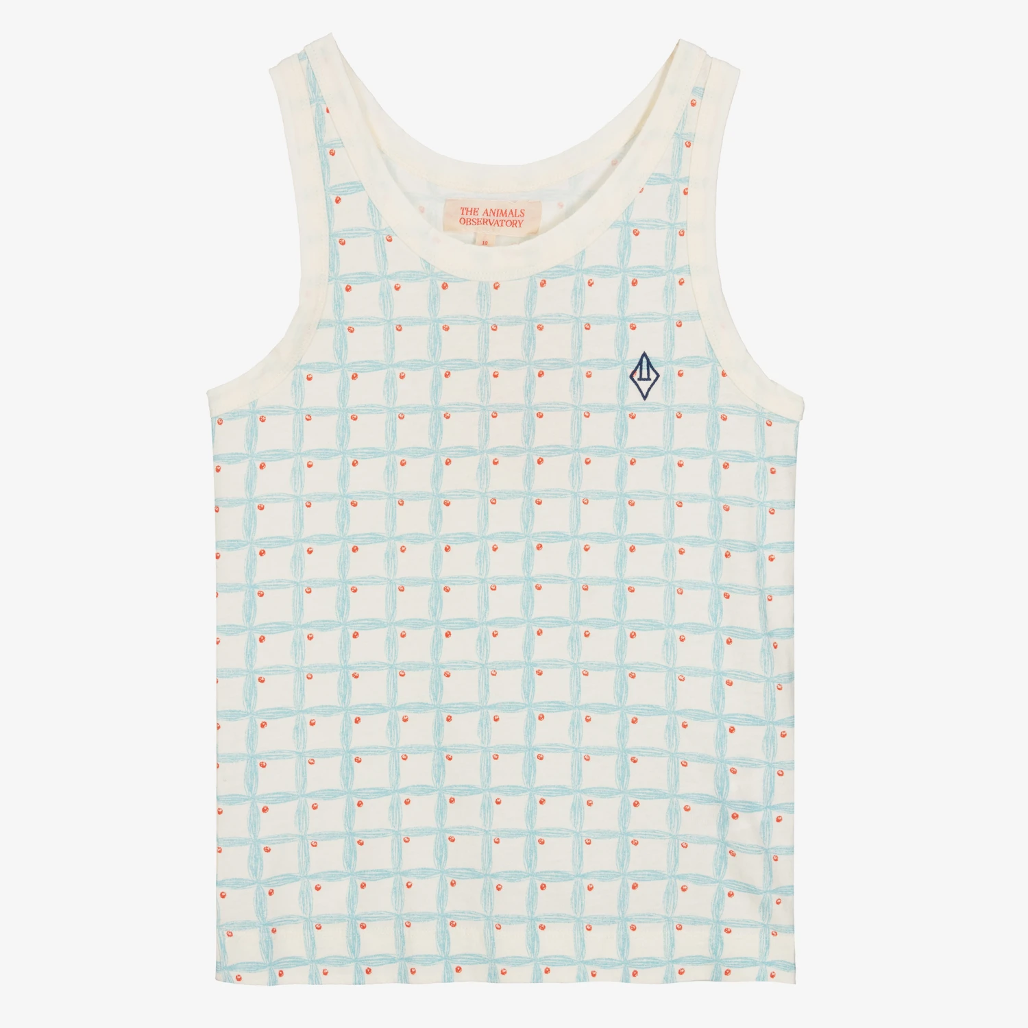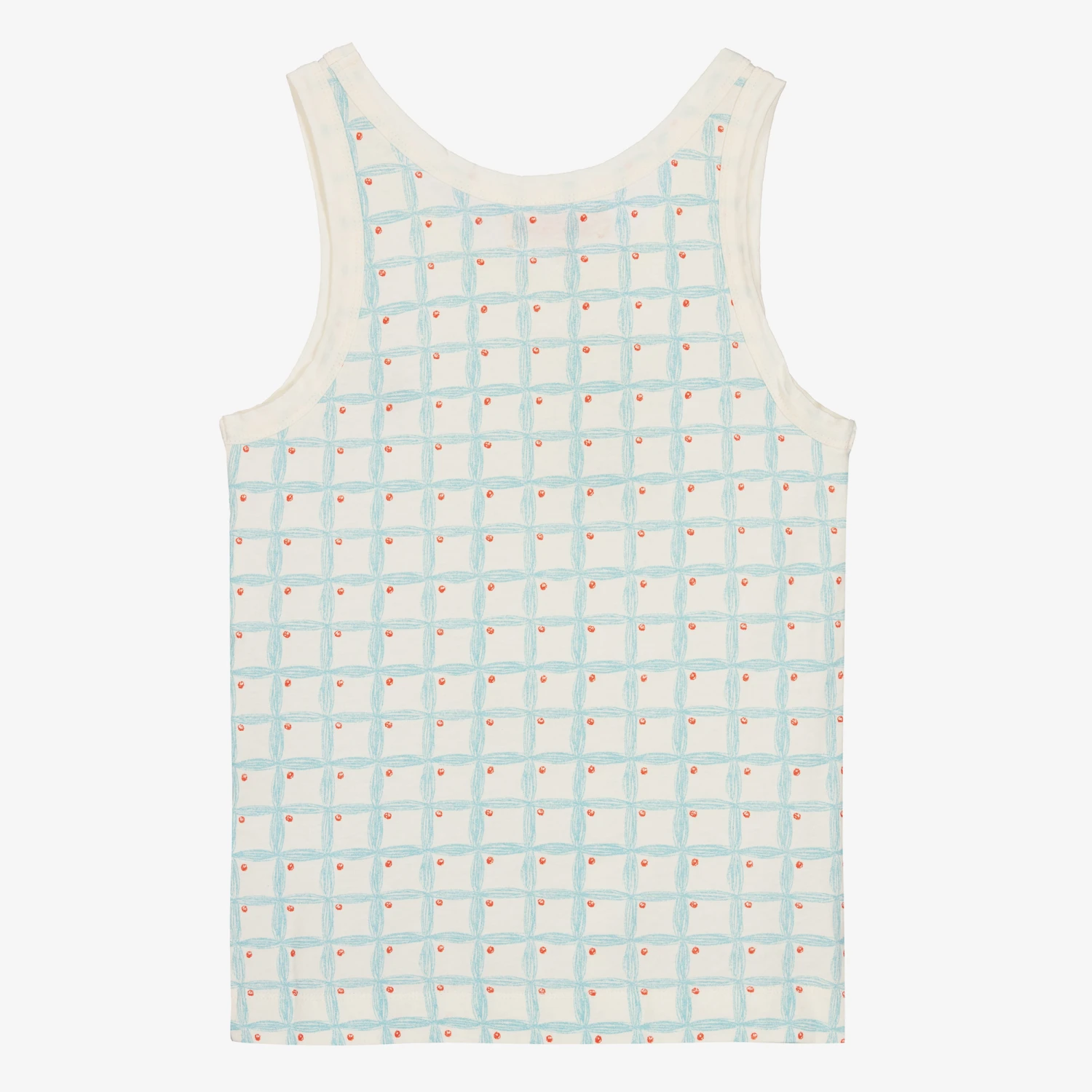 Eclectically styled, this ivory vest top for teen girls is from The Animals Observatory. The brand’s signature diamond logo is embroidered on the chest in dark blue, for a boldly recognisable style. It has a quirky blue grid pattern, with red spots in a dynamic, hand-drawn effect. Made in the softest cotton jersey, this top is great for warm-weather styling.