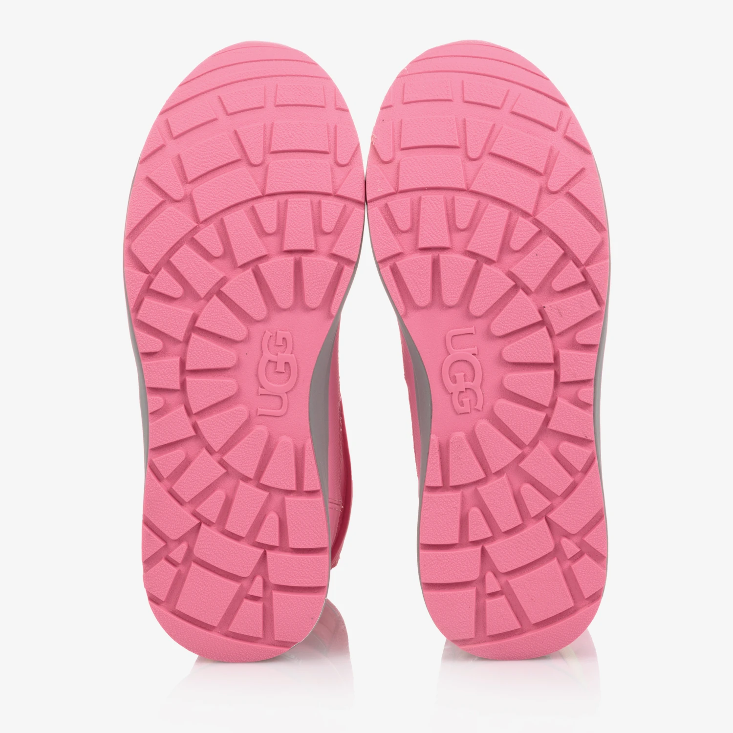 Teen girls bright pink snow boots by Ugg. These fun boots have rainbow trims and a reflective logo in the velco fastening strap. Designed to help protect against mild or moderate weather conditions, they are made with waterproof leathers and textiles. For warmth, they are lined in polar fleece and the inner sole is made from fluffy sheepskin. A deep tread, non-slip rubber outer sole provides a sturdy grip.