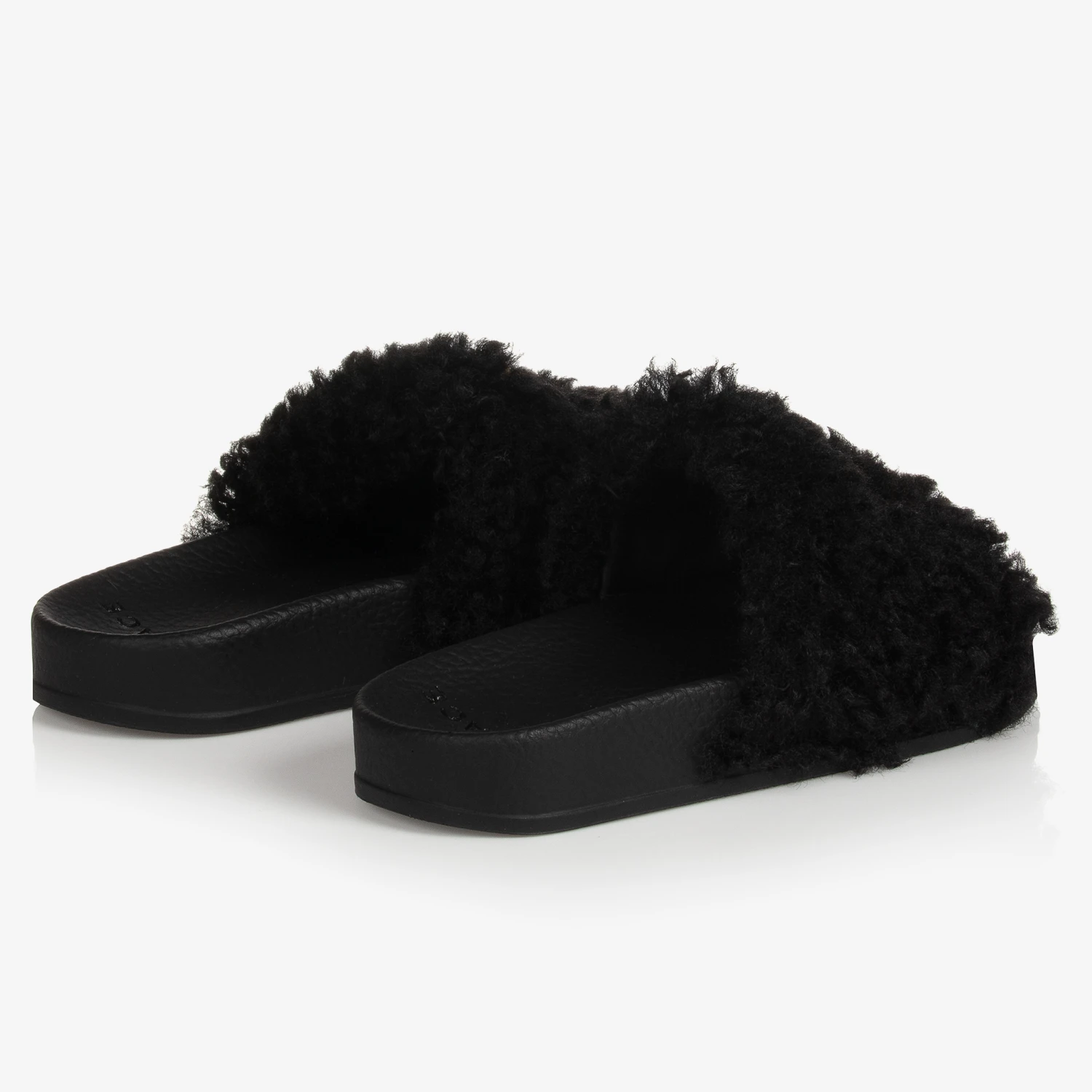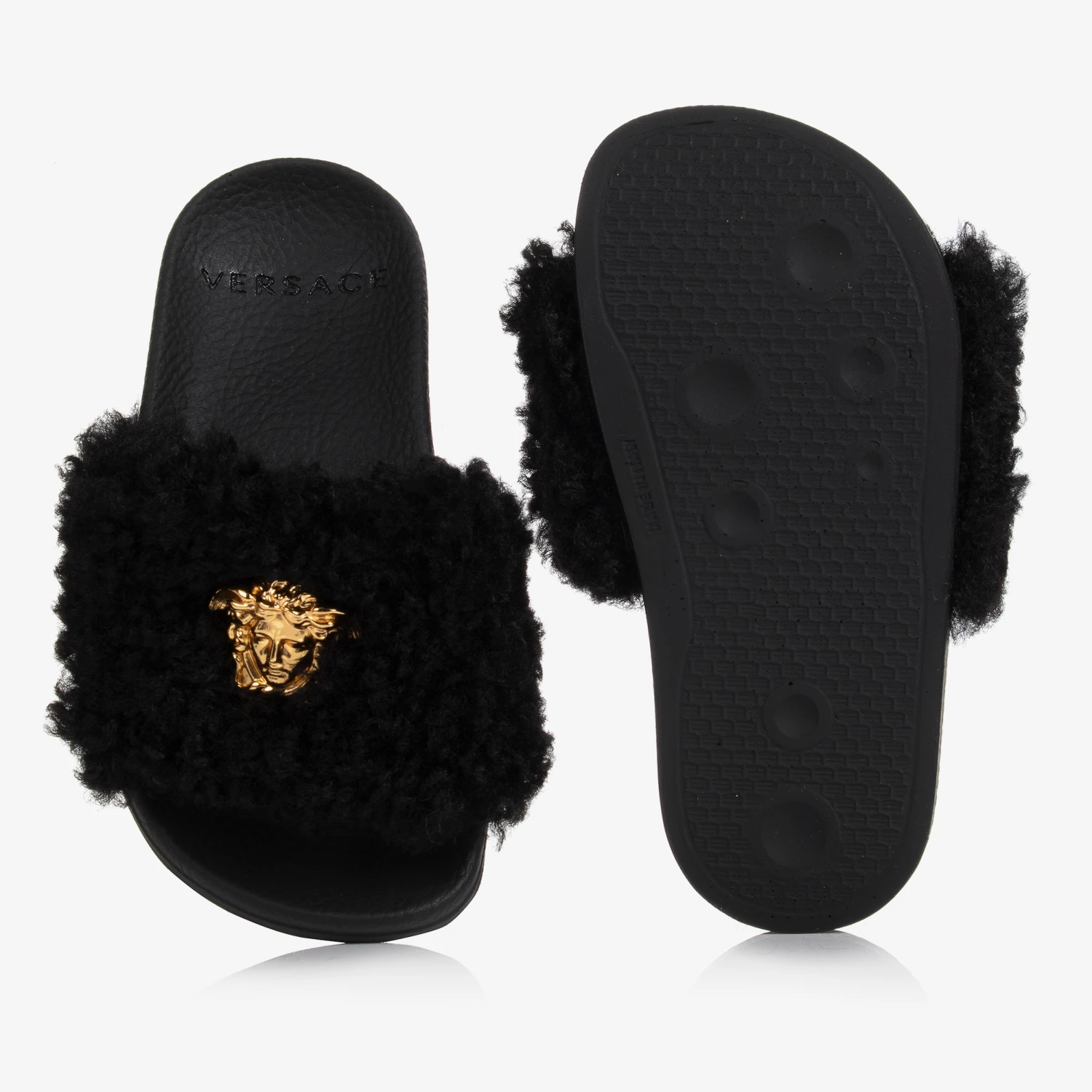 Black faux fur sliders for teen girls from Italian designer Versace, embellished with an iconic three-dimentional gold Medusa logo for a luxurious touch. Easy to slip on, they have super soft, black faux fur straps with a moulded footbed for added comfort.