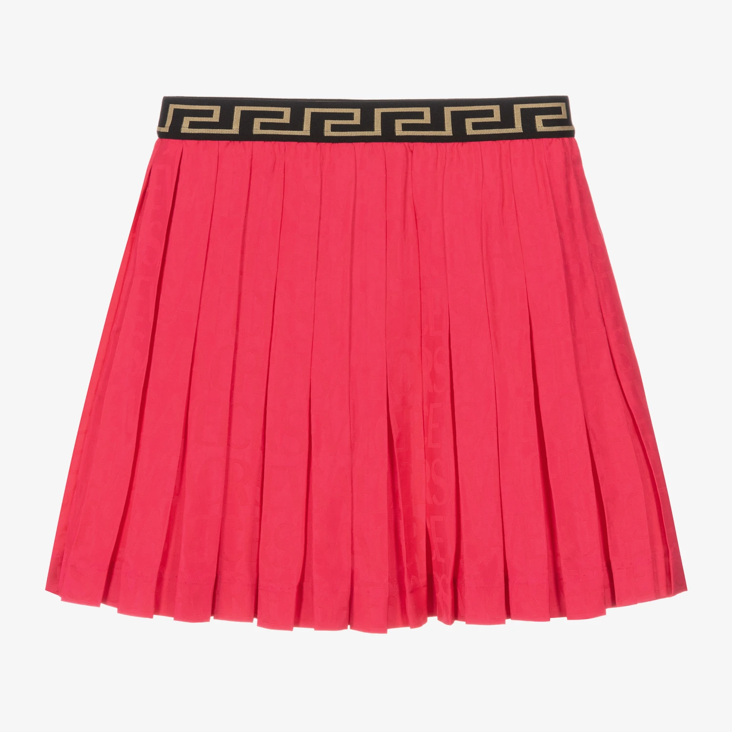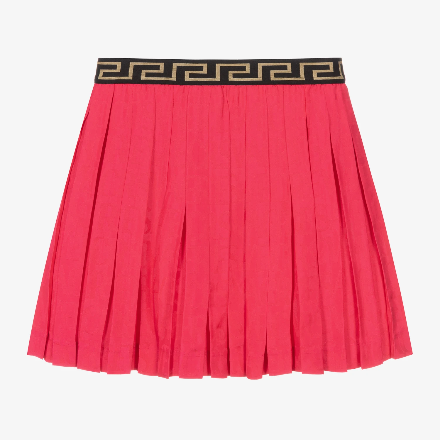 Bright fuchsia pink enters Versace’s new season with this luxurious pleated satin midi skirt for teen girls. It effortlessly incorporates a subtle jacquard logo within the floaty material, and has a black and gold La Greca waist for an opulent finish.