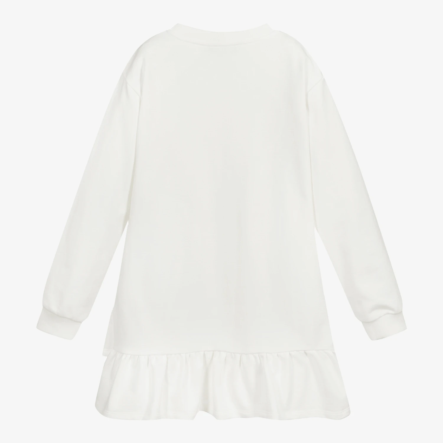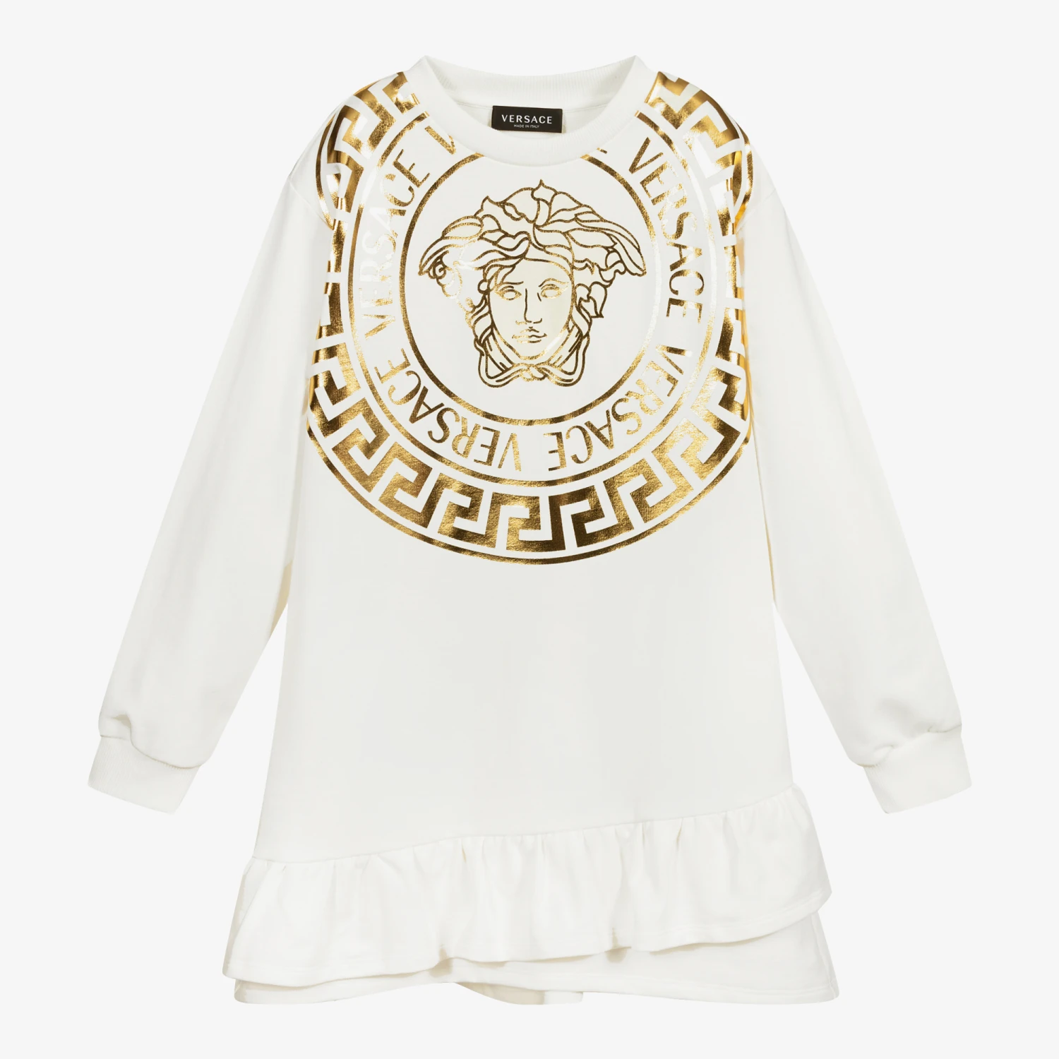 Teen girls ivory sweatshirt dress from luxury Italian designer Versace. Made in soft sweatshirt jersey, it is equal parts bold and comfortable. It has a shiny gold Medusa logo print on the front and an asymmetric ruffle hemline.