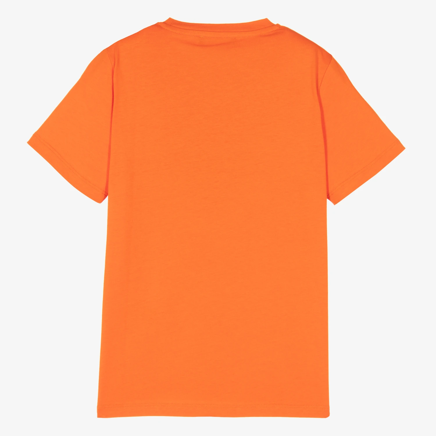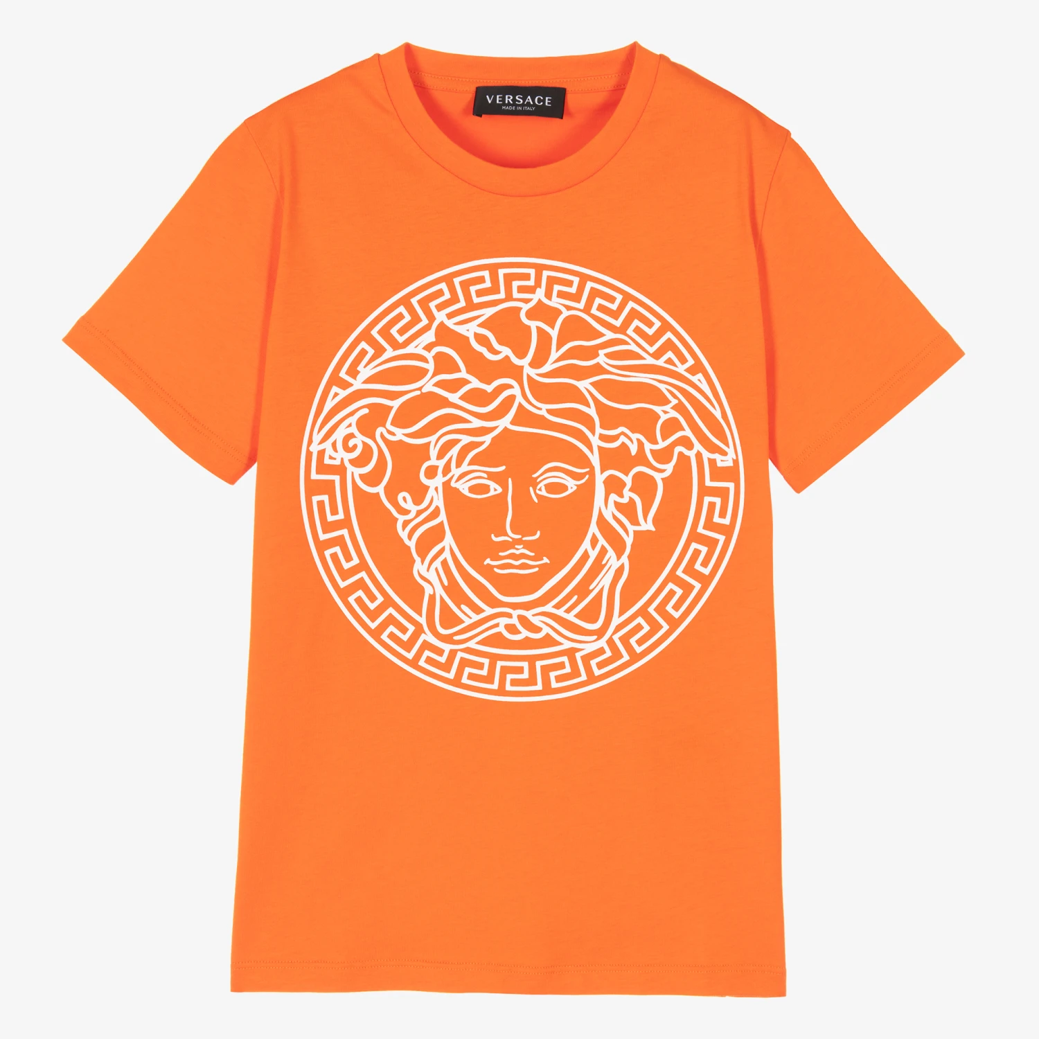 Teen boys and girls orange T-shirt by luxury Italian brand Versace, with their iconic white Medusa logo print on the front, for an instantly recognisable statement look. Super casual, it is made in the soft cotton jersey, ideal for lasting comfort.