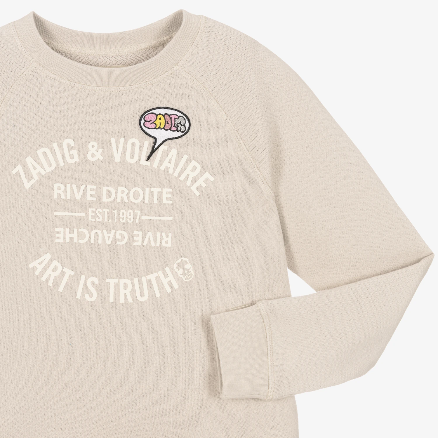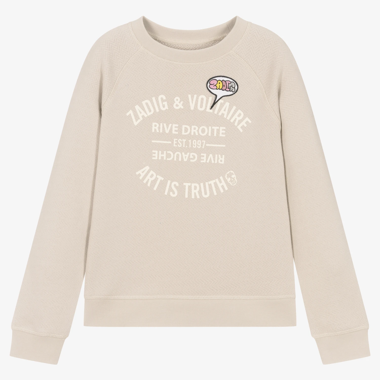 A pale grey-beige sweatshirt for teen girls by Zadig&Voltaire, designed with a college-inspired logo and cartoon-style motif inside a colourful speech bubble appliqué. Inspired by the adult collection, this versatile piece is made in mid-weight cotton jersey with a faint zigzag pattern. The ‘Art is truth’ slogan sits alongside a subtle skull motif for a signature feel.