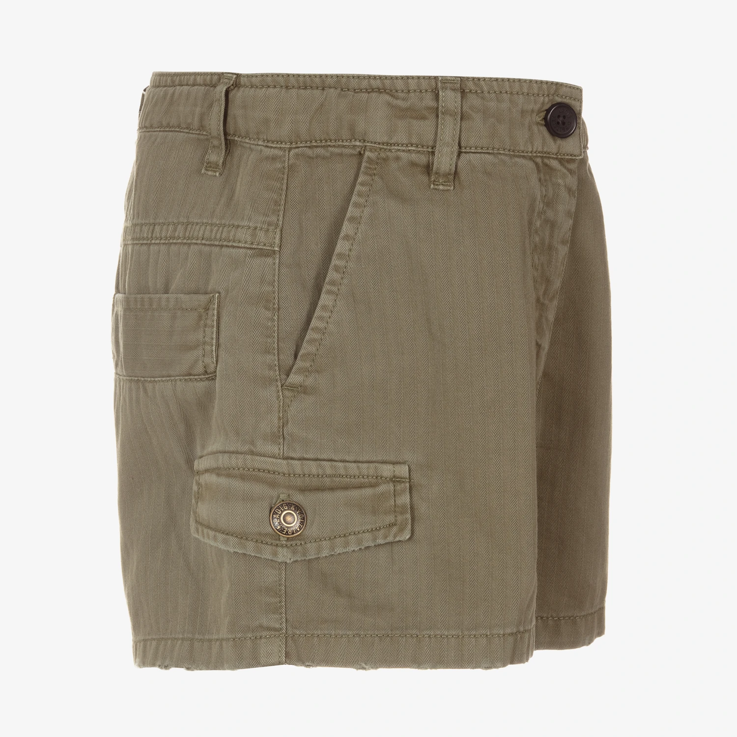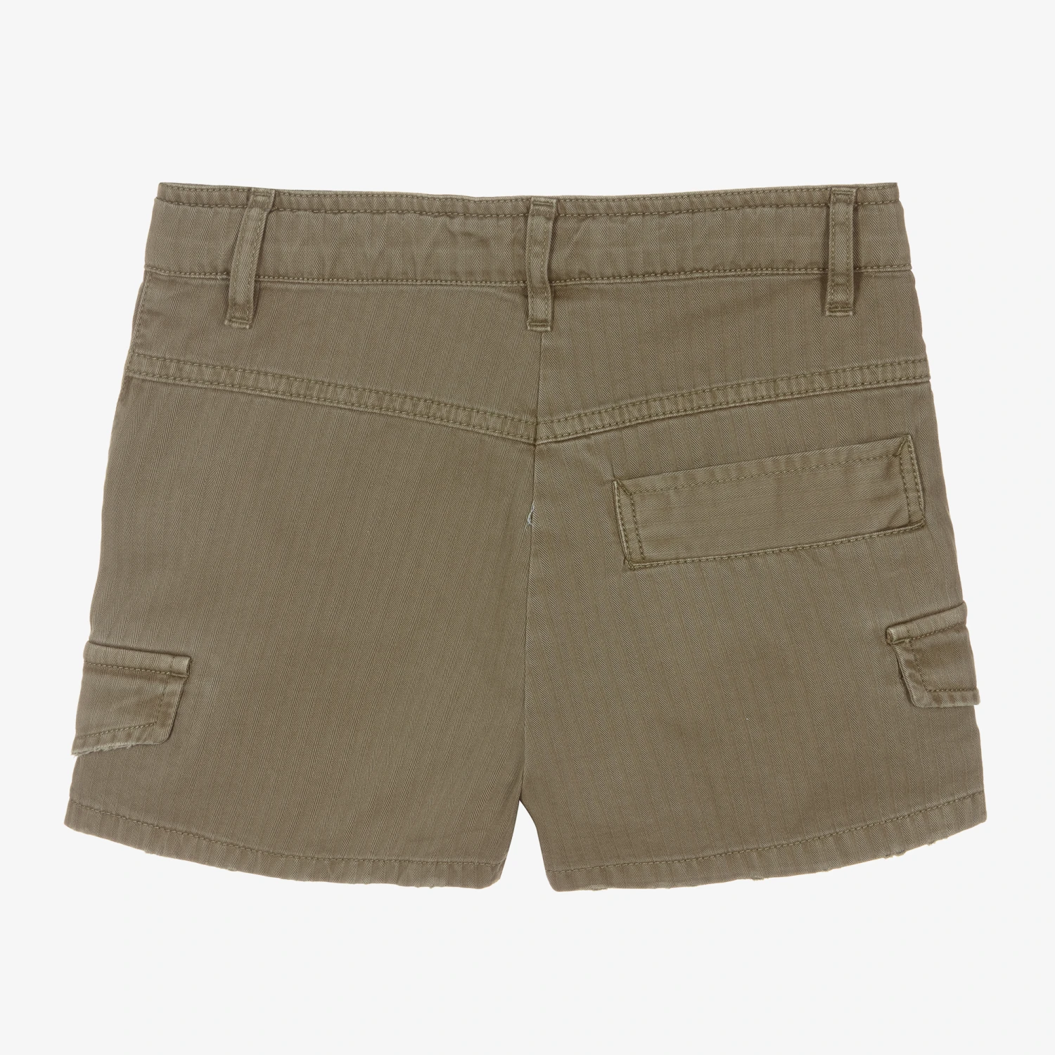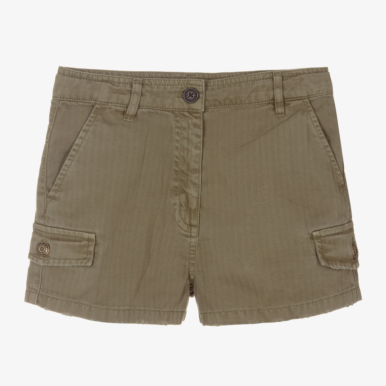 Khaki green shorts for teen girls by Zadig & Voltaire Kids, made in soft herringbone cotton twill. They have front and back pockets and mini cargo pockets with branded metal buttons on the legs. They fasten with a button and zip and have a useful adjustable waist.